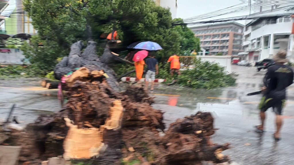 ฝนตกหนักตลอดทั้งคืน ส่งผลให้ต้นพยอมอายุนับร้อยปีคู่เมืองที่ยืนตระหง่านหน้าไปรษณีย์ริมน้ำหักโค่นลงมาพาดขวางถนนพุทธบูชา เคราะห์ดีเหตุเกิดเช้าวันอาทิตย์ที่มีฝนตกต่อเนื่อง ประชาชนไม่ออกมาออกกำลังกาย หากเป็นวันเรียนตามปกติอาจมีผู้ได้รับบาดเจ็บ